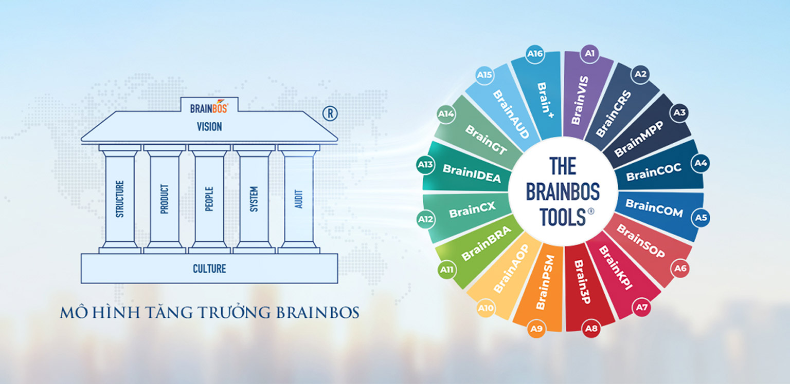 3) Chuẩn hóa hệ thống quản trị (theo BrainBOS): Chuẩn hóa cơ cấu, quy trình, OKR/KPI, ma trận RACI, hệ thống báo cáo—để doanh nghiệp vận hành bằng hệ thống, không lệ thuộc cá nhân.