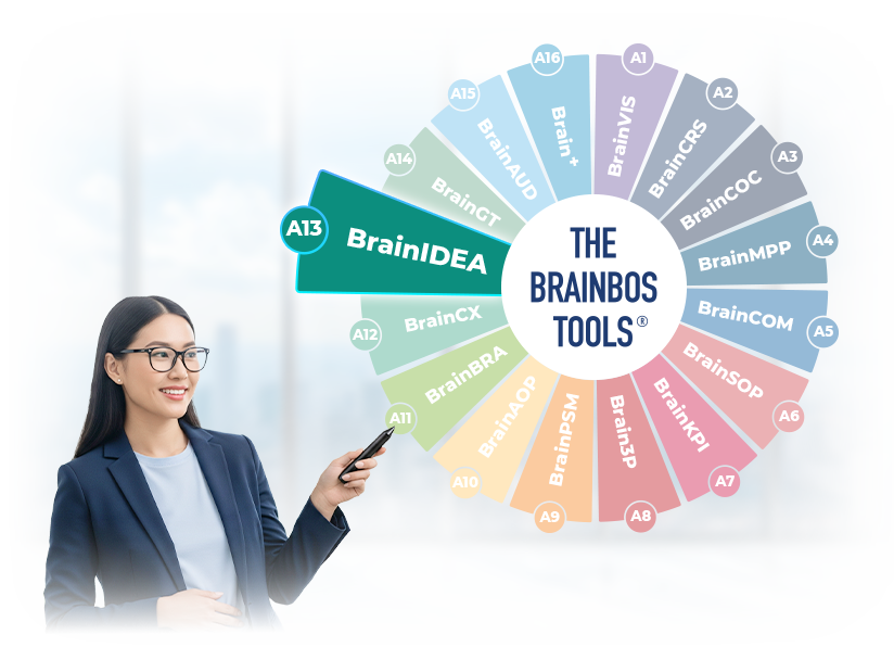 BrainIDEA là công cụ A13 trong mô hình BrainBOS của BrainMark, hỗ trợ Doanh nghiệp thiết lập một hệ thống sáng kiến cải tiến bài bản, có quy trình và tiêu chí rõ ràng. Công cụ này giúp biến ý tưởng rời rạc thành sáng kiến thực tiễn, gắn chặt với mục tiêu chiến lược và hiệu quả vận hành của Doanh nghiệp.
