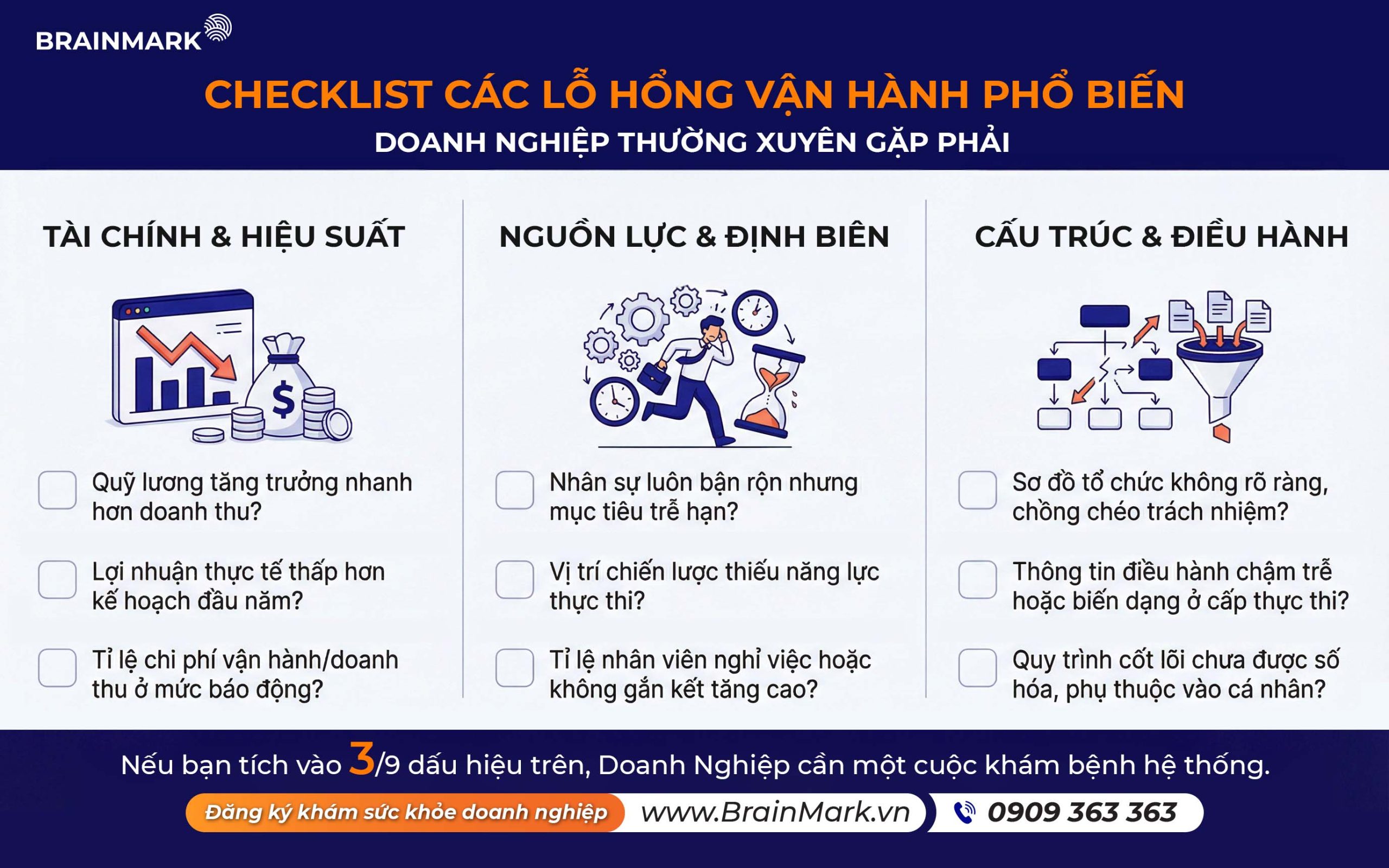 Đừng để những sai lệch nhỏ hôm nay trở thành lực cản lớn cho tương lai. Hãy liên hệ ngay với đội ngũ chuyên gia của BrainMark để được hỗ trợ chẩn đoán 1:1 và thiết lập lộ trình tối ưu hóa vận hành toàn diện cho doanh nghiệp của bạn.